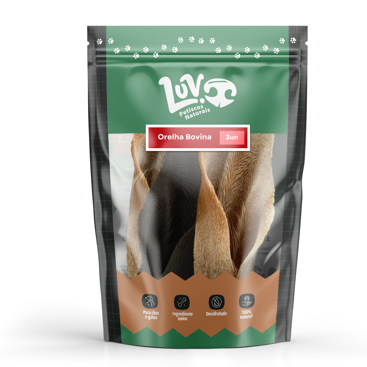 Este mastigável, de rigidez moderada, possui uma aparência impactante, pois é feito a partir das orelhas de bovinos, incluindo pelos, por isso é recomendado oferecê-lo com menos frequência, de preferência em ambientes externos. Ao entrar em contato com a saliva, pode apresentar um aroma característico de “boi no pasto”.